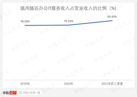 2019-2021年前三季度,随用随还办公IT服务收入占营业收入的比例,一直保持在80%左右。