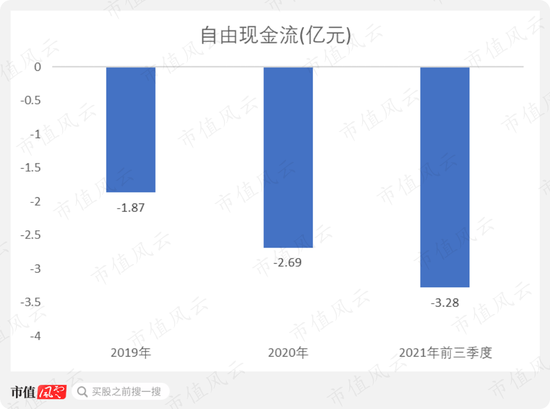 自由现金流净流出在2019年为1.87亿元,2020年扩大至2.69亿元,2021年继续扩大,光是前三个季度就达3.28亿元,已经超过2020年全年的水平。