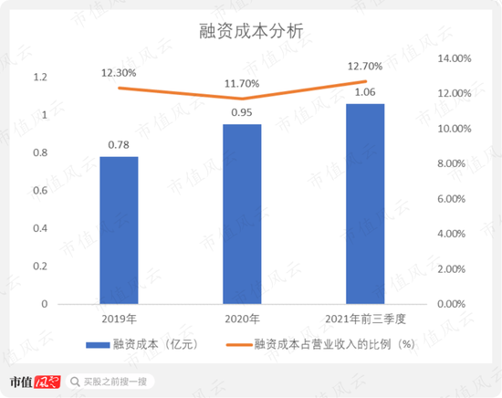 公司的融资成本(主要是借款利息),从2019年的0.78亿元,上涨至2021年前三季度的1.06亿元,目前已经成为仅次于销售费用的第二大费用性支出。