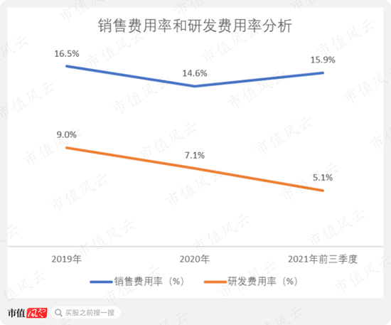 公司最多的费用性支出,就是用在了营销。2019-2021年前三季度,销售费用率基本保持在15%左右,研发费用率则从9%不断下滑至5.1%。