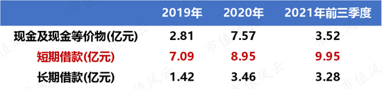 2019年末到2021年三季度末,公司的短期借款一直高于现金及现金等价物,且债务规模越滚越大。