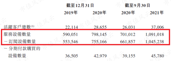 截至2021年三季度末,易点云租出去的电脑设备已经达到109万台。其中,采用订阅方式的有105万台,占比高达96%;剩余部分是客户分期付款购买,只有4.6万台,占比非常低。