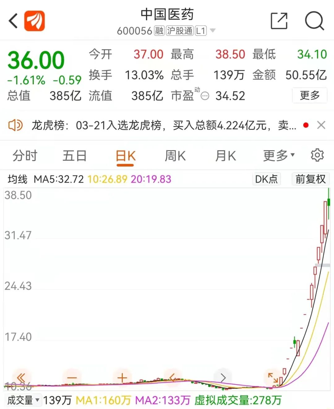 大牛股中国医药日内剧烈震荡,暂时止步四连板。截至发稿报35.76元,跌2.27%,成交金额已超过50亿元,日内振幅超12%。