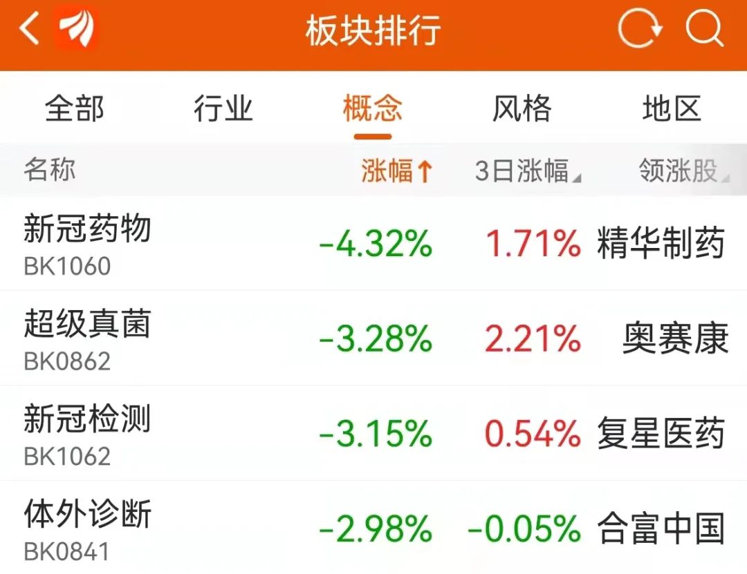 受上述消息影响,22日早盘,新冠新冠特效药、新冠肺炎检测、抗原检测板块集体大步回撤。