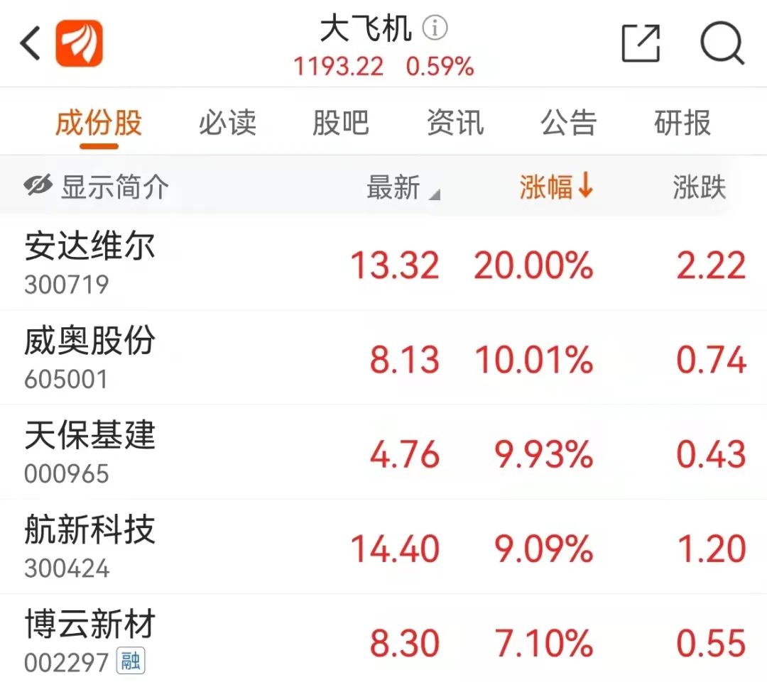 大飞机板块中,安达维尔20CM涨停。威奥股份、天保基建等跟涨。