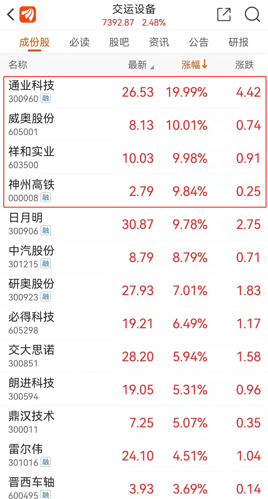 高铁板块中,通业科技、神州高铁、祥和实业涨停,日月明、威奥股份涨近10%,鼎汉技术、晋西车轴等跟涨。