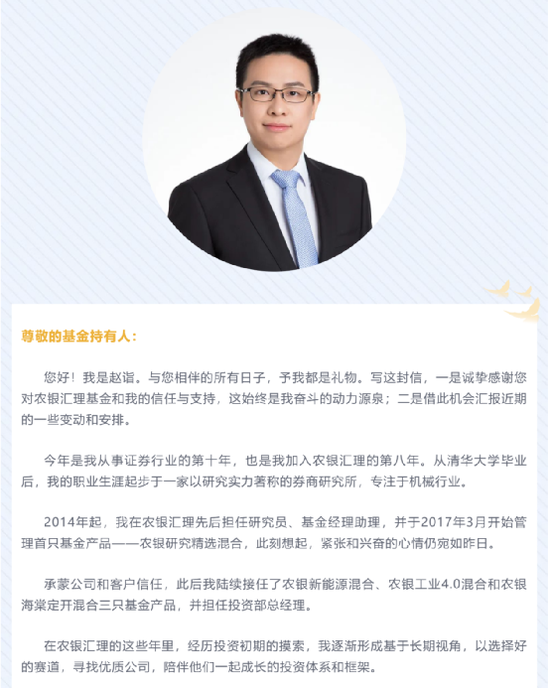 在信中,赵诣表示:“我与农银汇理投研团队一路相伴成长,有着很深厚的感情,同时也坚信农银团队会秉持既有的投资理念,立足于基本面精选行业和公司,坚守长期投资,也希望大家能够继续支持农银汇理基金。”