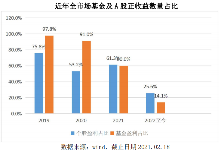 据wind数据,以2019-2020年公募市场股票型开放基金为例,全市场公募基金当年实现正收益的占比分别为97.8%、91.0%,而同期A股市场实现正收益的占比为75.8%、53.2%;在回报程度表现上,全市场公募基金当年实现中位数收益分别为27.58%、26.77%,大幅跑赢同期个股中位数收益,强势演绎了“炒股不如买基金”的赚钱效应。