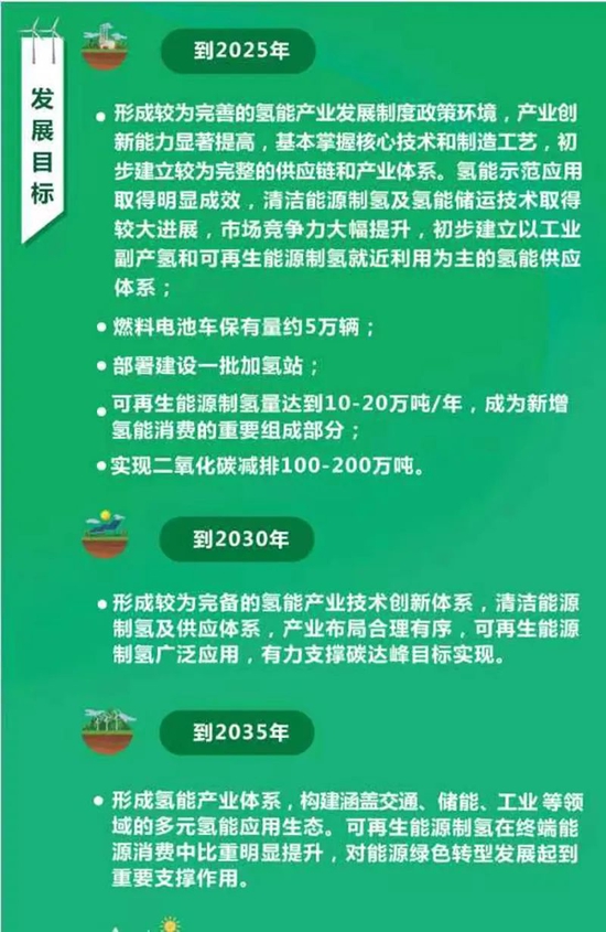 再经过5年的发展,到2030年,形成较为完备的氢能产业技术创新体系、清洁能源制氢及供应体系,产业布局合理有序,可再生能源制氢广泛应用,有力支撑碳达峰目标实现。