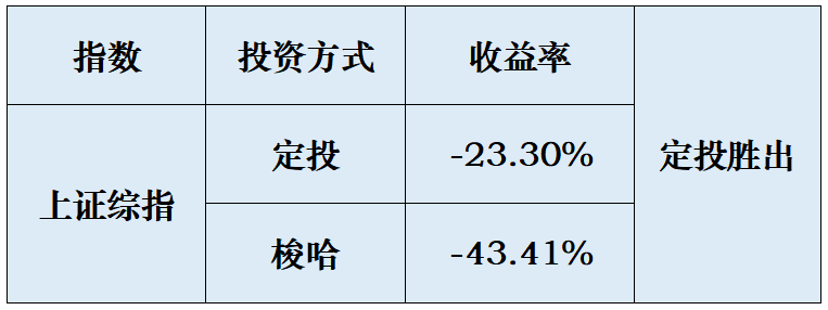 (定投数据来源:Wind,U8指数定投计算器,定投公式:定投收益率=[(sum(每期定投金额/每期净值)*期末净值)/(sum(每期定投金额*投资期数))]-1。使用U8指数定投计算器计算,以上证综指为模拟定投标的,定投方式为月定投,红利再投资,定投金额为1000元,此模拟为历史模拟收益率,模拟收益不代表历史的真实收益,也不代表未来的预期收益。)