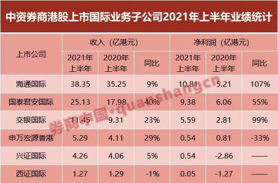 值得注意的是,仅看2021年上半年业绩的话,上述券商其实财报表现还是可圈可点的。券商中国记者统计发现,2021年上半年,海通国际、国泰君安国际、交银国际3家券商净利润均实现大幅上涨,分别为107%、55%和99%;而兴证国际和西证国际也同步扭亏,上半年净利润分别为5383万港元和526万港元;仅有申万宏源香港一家净利润同比下滑33%。