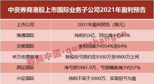 从此前已发布去年盈利预告的5家中资券商看,海通国际和交银国际两家体量较大的公司均表示利润下滑超过50%,而申万宏源香港、西证国际则双双亏损,只兴证国际实现扭亏为盈,预计纯利约3000万港元。