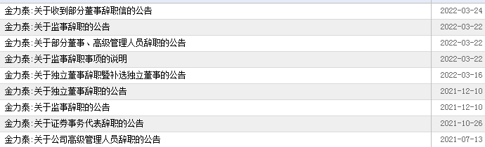 此前3月15日,于2019年12月30日开始任职金力泰独立董事的吴益兵递交辞呈。2021年12月10日,于吴益兵、王澜同期开始任职独立董事职务的孙敏杰更早一步辞职;同日,前监事江昌雄递交辞呈。去年10月底,金力泰证券事务代表隗聪辞职。12月2日,金力泰董事长景总法请辞,只保留董事职务。同年7月份,该公司前副总裁张岚也辞职。