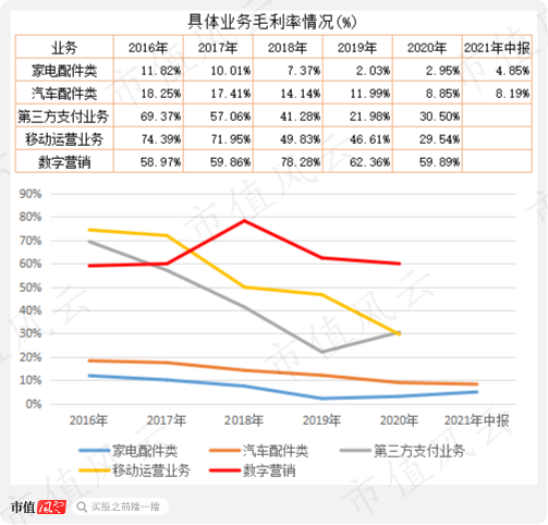 第三方支付与移动运营两项业务的毛利率下降非常明显,该两项业务均是其跨界后的核心业务;