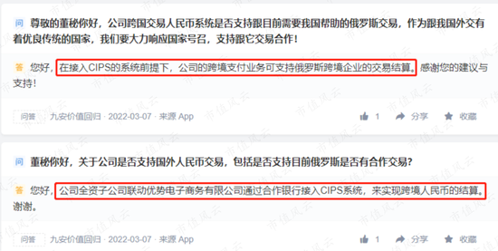 这个回复就神了,称“跨境支付业务可支持俄罗斯跨境企业的交易结算”,但是董秘压根就没说该公司至今没有开展与俄罗斯跨境企业结算业务。