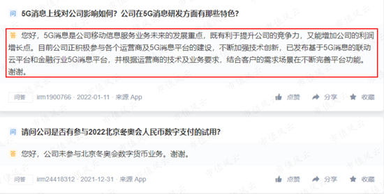 2022年1月11日,再次在互动易平台上,董秘回复提问称该公司“正积极参与各个运营商及5G消息平台的建设,不断加强技术创新,已发布基于5G消息的联动云平台和金融行业5G消息平台”。