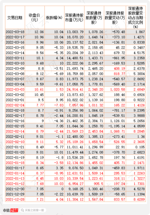 3月8日至9日,海联金汇股价大幅下跌,北向资金逆势加仓,两天合计买入1127万股;随后,3月10日涨停,3月11日一度冲击涨停,北向资金再次高抛卖出862万股。