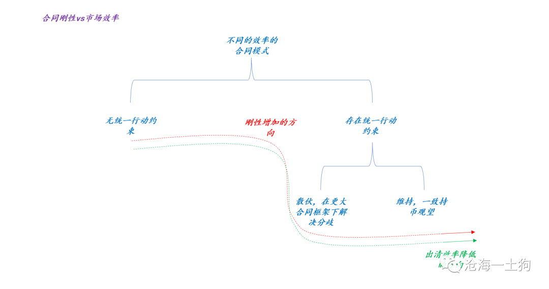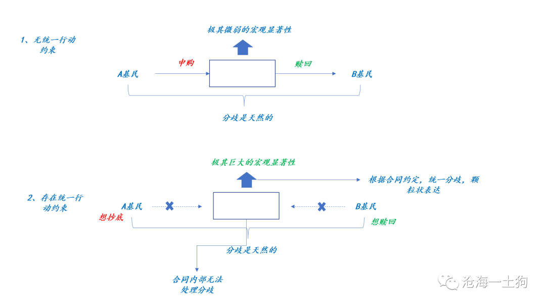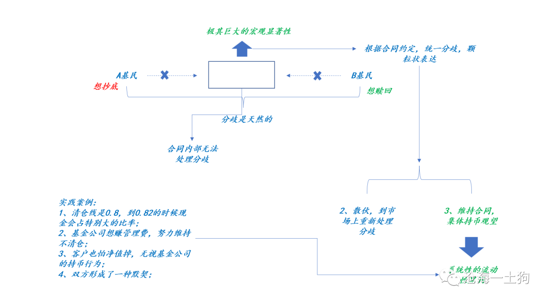 在合同刚性增加的情况下,情况就有所不同,如上图所示,即便立场分歧(ps:A有钱,B没钱)使得A基民想抄底,B基民想赎回,但是,合同约束使得投资者们只能先统一操作——清仓,然后,A和B再重新根据自己的新立场去自由市场上表达自己的看法。