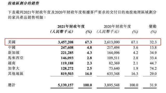 从收入区域划分来看,2021年全年汇森家居超95%的销售收入来自海外。其中,仅美国市场的收入占比便达到了67.3 %,居第二位的中国市场占收入的4.8%。 汇森家居方面向《华夏时报》记者表示,美国市场一直是集团产品的主要市场,主要海外市场还包括北美其他国家、东南亚及欧洲市场等。