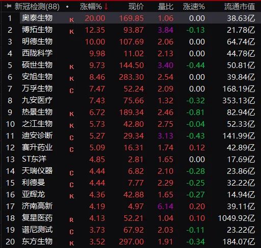 新冠检测股当中,奥泰生物披露业绩预增,20%一字涨停,博拓生物、明德生物、西陇科学等大涨。