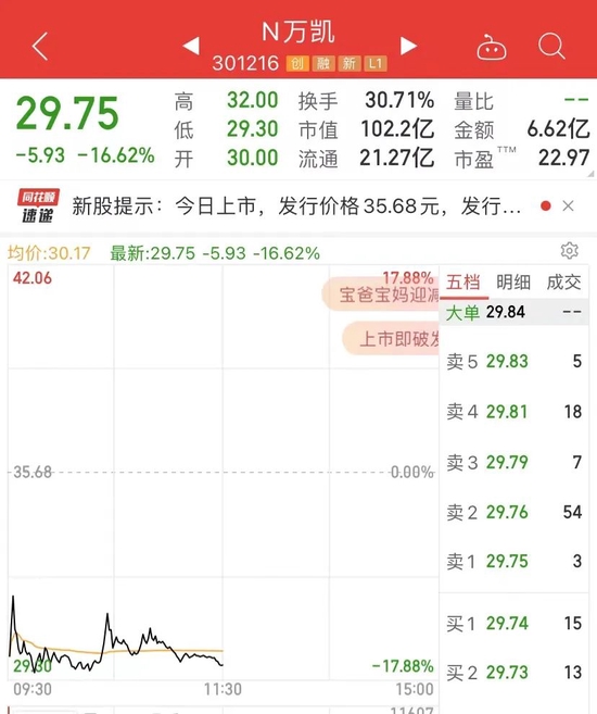 今天A股有3只新股上市,其中N万凯上市首日破发,上午收盘跌16.62%,一股跌5.93元,作为创业板新股,一签500股要亏约3000元。盘中一度,一签跌超3000元。