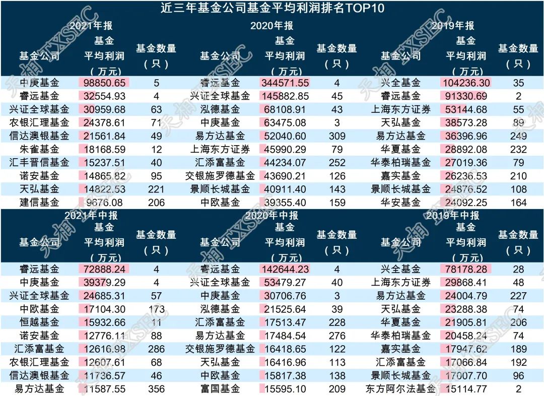近三年基金公司旗下产品总利润排名TOP10,来源:天相投顾此外,2021年,从近三年基金公司旗下产品平均利润排名TOP10中可以看出,中庚基金、睿远基金和兴证全球基金保持领先,旗下基金平均利润分别约为9.89亿元、3.26亿元和3.1亿元。