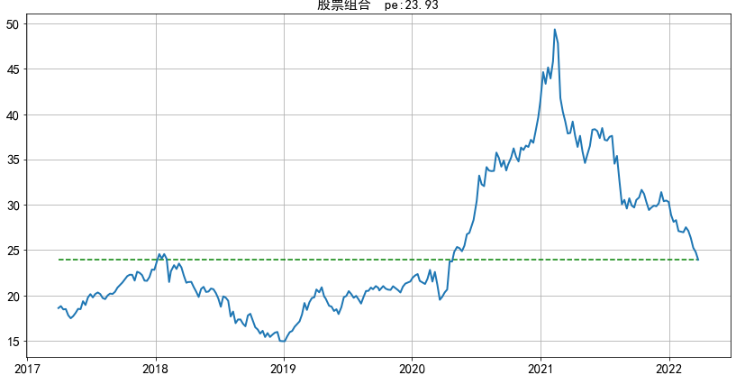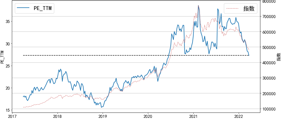 该指数当前市盈率约27,下图给出了该指数从2017年至今5年多时间的市盈率走势,图中蓝实线为市盈率、红虚线为指数,黑横虚线为当前市盈率: