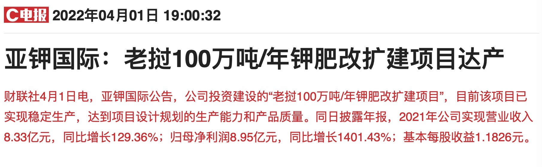 对于业绩增长的原因,亚钾国际表示,受国际钾肥价格上涨影响,产品毛利率显著提升。同时,随上述项目产能释放,企业盈利能力持续增强。