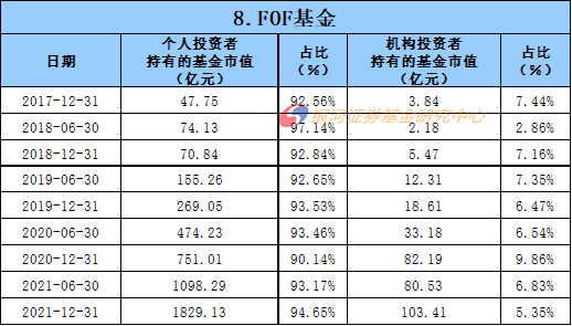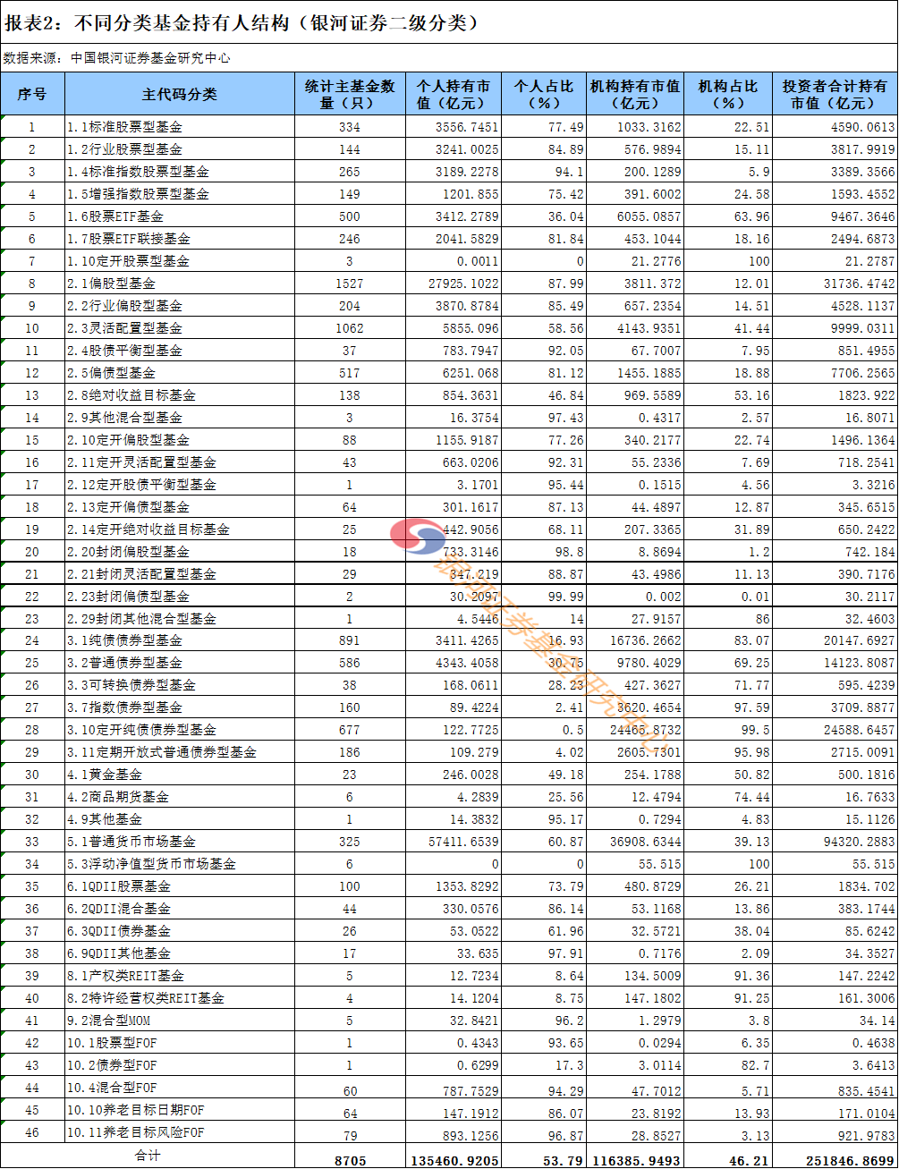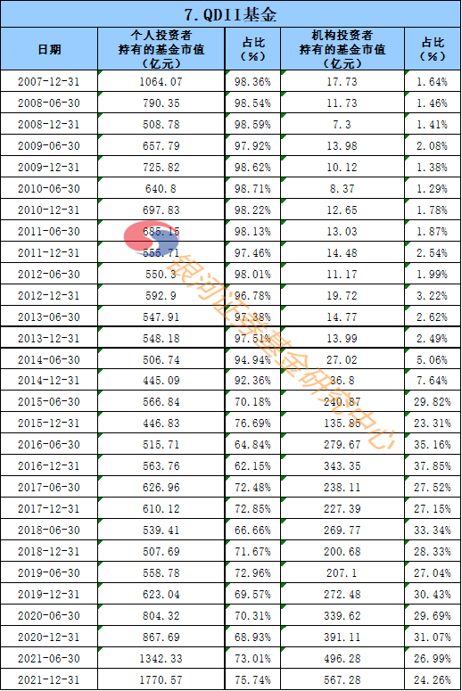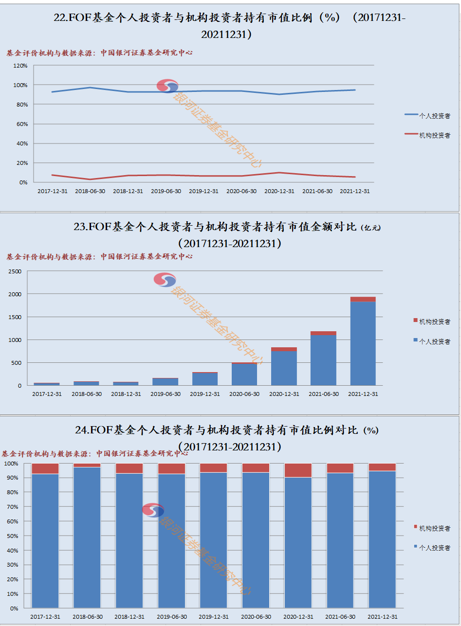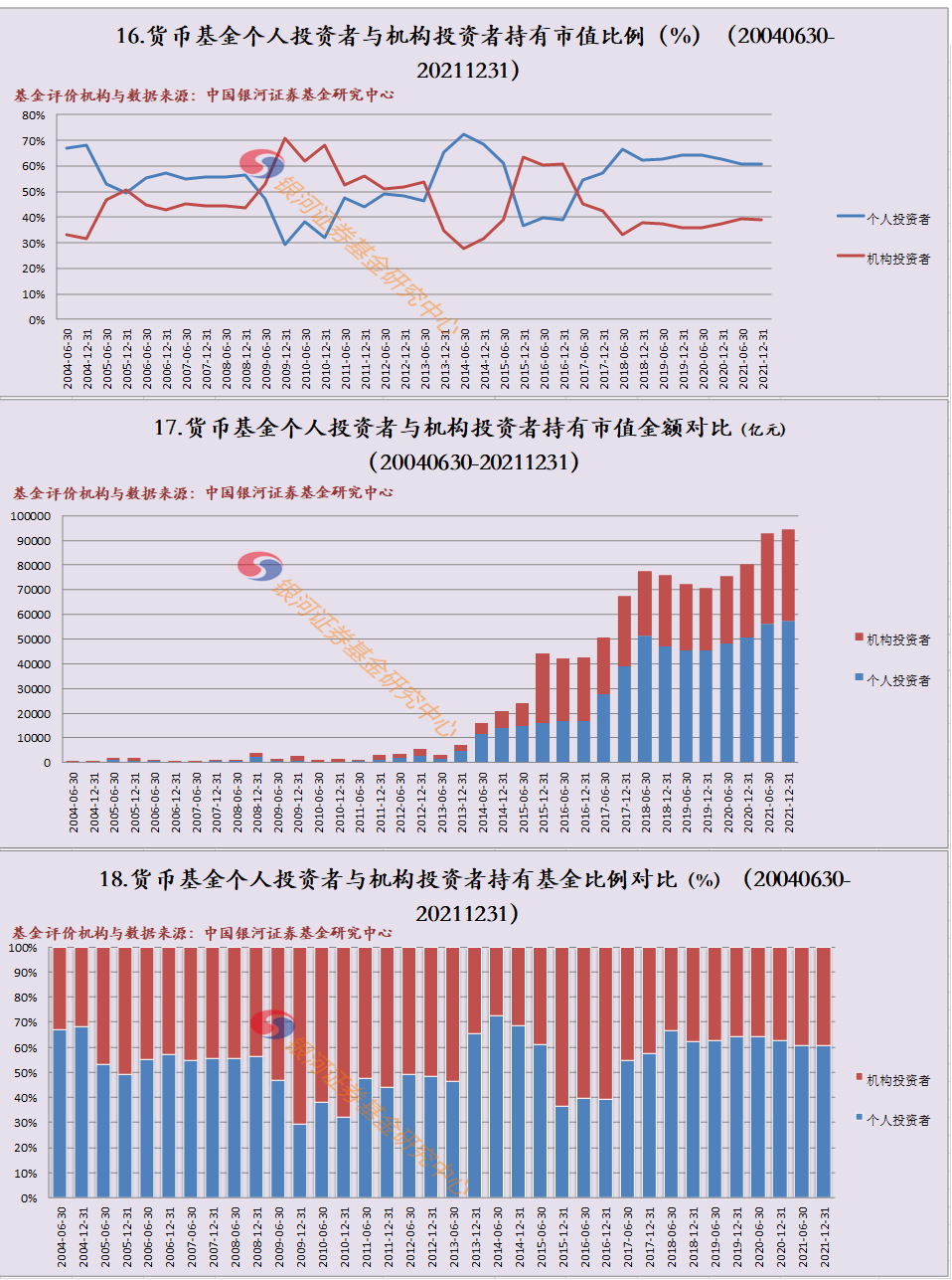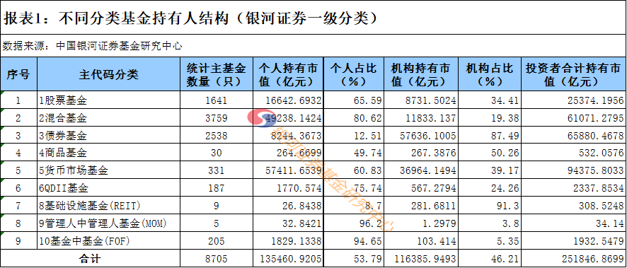 3、按照银河证券一级分类口径。截止2021年12月31日,结果如下:(1)股票基金上,个人持有16642.69亿元,个人占比65.59%;机构持有8731.5亿元,机构占比34.41%。(2)混合基金上,个人持有49238.14亿元,个人占比80.62%;机构持有11833.14亿元,机构占比19.38%。(3)债券基金上,个人持有8244.37亿元,个人占比12.51%;机构持有57636.1亿元,机构占比87.49%。(5)货币市场基金上,个人持有57411.65亿元,个人占比60.83%;机构持有36964.15亿元,机构占比39.17%。(6)QDII基金上,个人持有1770.57亿元,个人占比75.74%;机构持有567.28亿元,机构占比24.26%。(7)FOF基金上,个人持有1829.13亿元,个人占比94.65%;机构持有103.41亿元,机构占比5.35%。