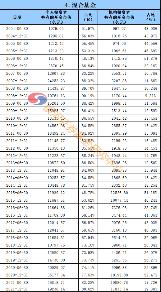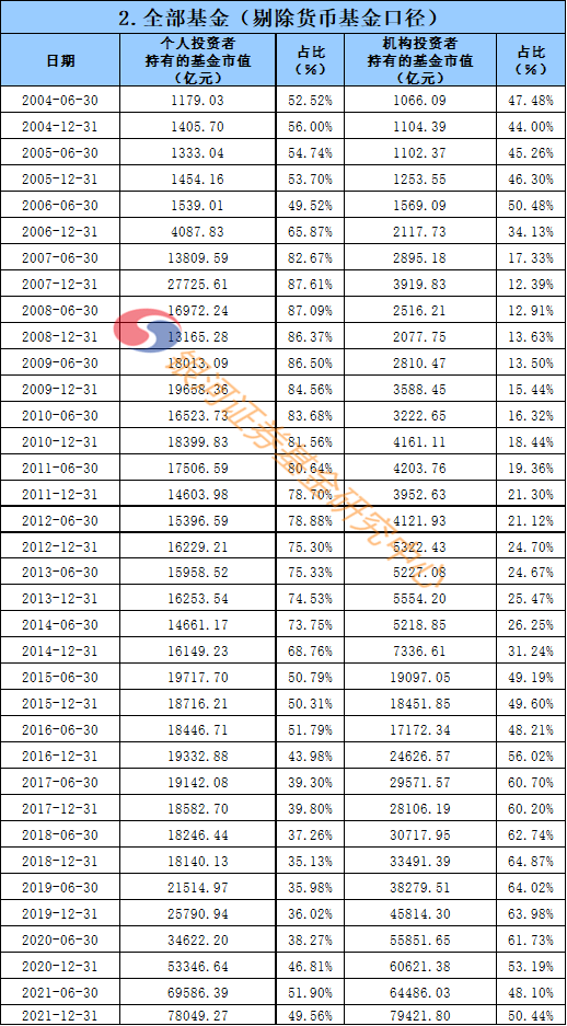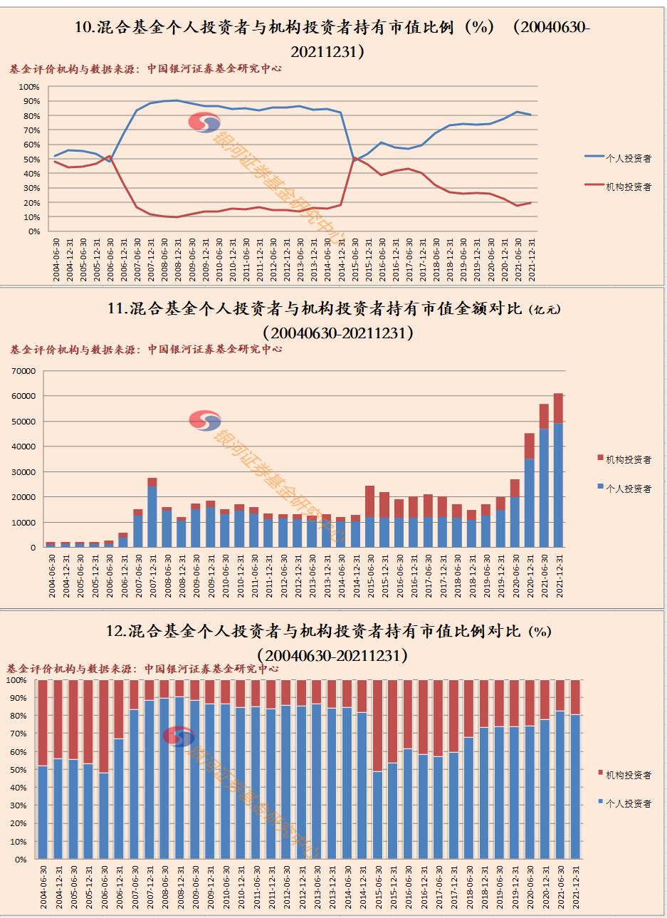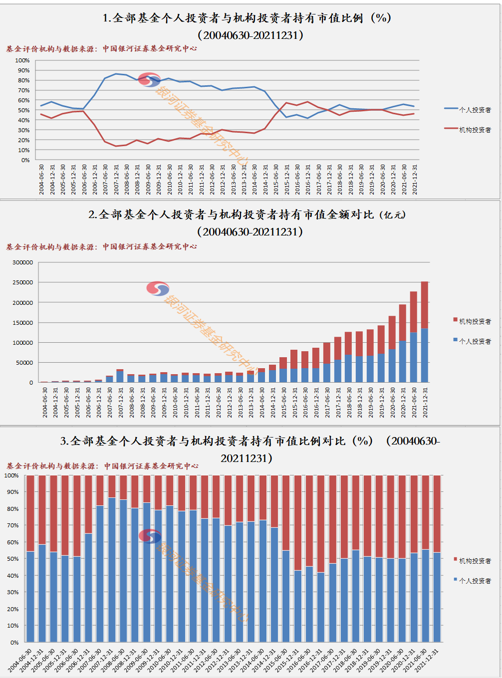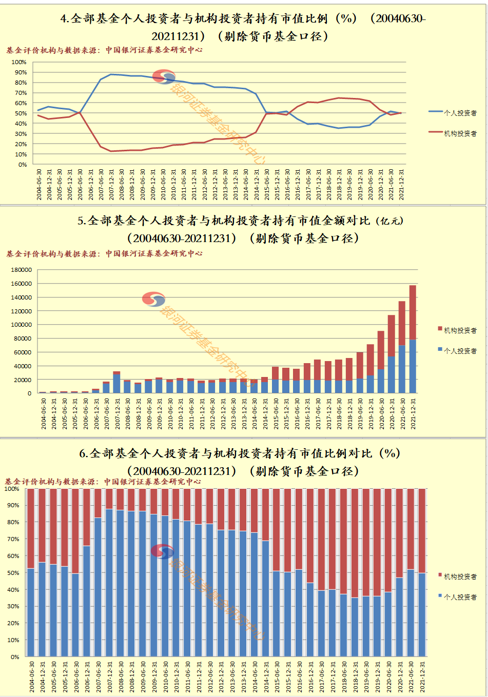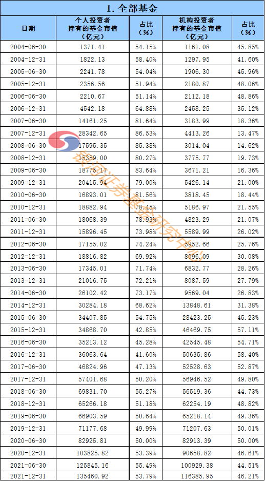1、数据处理说明。随着公募基金2021年年报公布完毕,中国银河证券基金研究中心完成了2021年12月31日这个截止点的公募基金持有人结构的原始份额(基础数据)、基金市值(计算数据,份额数量*份额净值)的处理,通过折算为基金市值后,不同基金、不同基金类型、不同基金管理人之间可以有效对比。我们采取了交易份额基金、主基金两套独立运行的持有人结构数据体系,两套独立维护各自计算,最后结果互相校对。经过多方面的数据校对复核后,我们对基础数据梳理完毕并通过底层计算与固定报表进行展示。公募基金从2004年中报开始,按照交易份额基金口径,披露基金持有人户数、个人持有份额、机构持有份额这3个数据。我们一并完成历史全部数据的维护、校对和复核,个别基金信息披露时滞的数据在事后补齐。