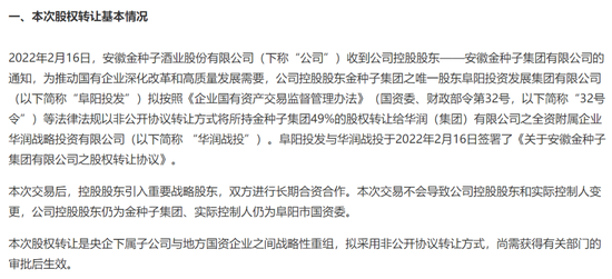 2月17日,金种子酒发布公告称,为推动国有企业深化改革和高质量发展需要,控股股东阜阳投资发展集团有限公司拟以非公开协议转让方式将所持金种子集团49%股权转让给华润(集团)有限公司之全资附属企业华润战投。该交易不会导致金种子控股股东和实际控制人变更。本次股权转让是央企下属子公司与地方国资企业之间战略性重组。