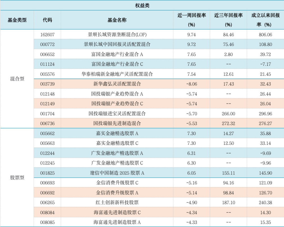 表2:上周各权益类基金收益表现(涨幅前5位及跌幅前5位)