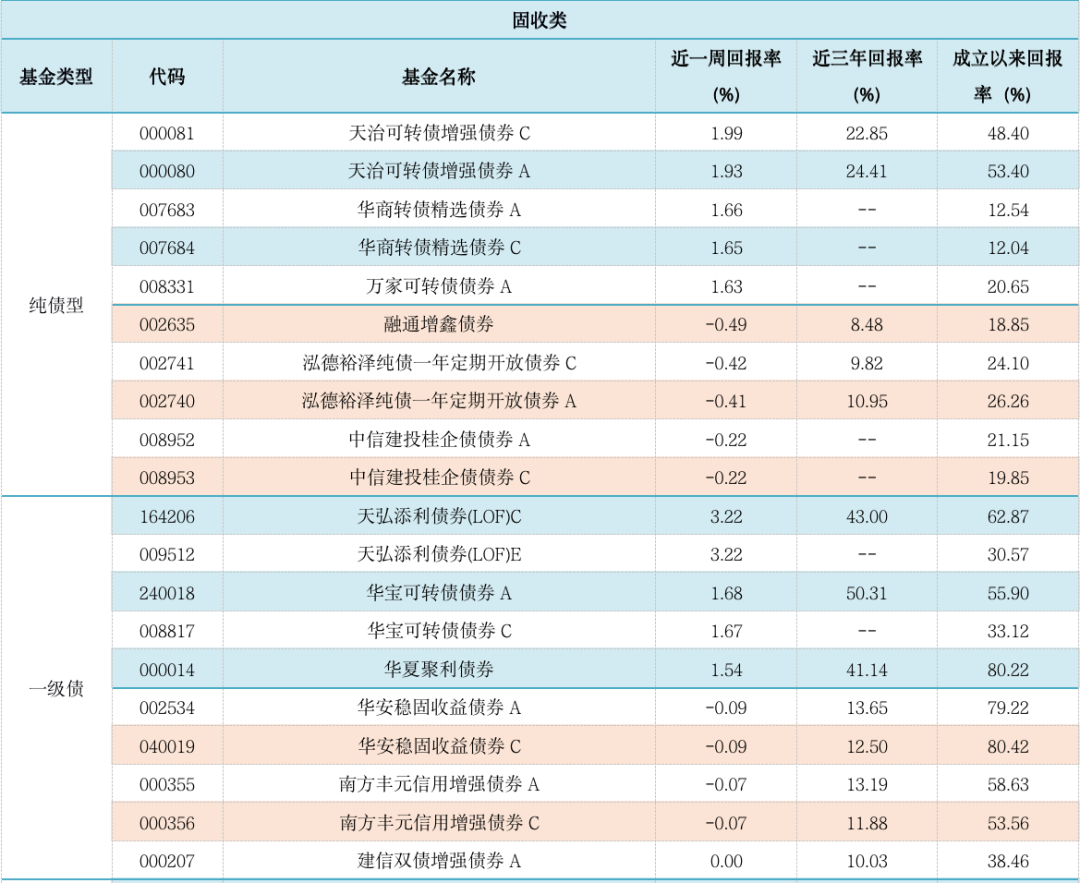 表3:上周固定收益类基金收益表现(涨幅前5位及跌幅前5位)