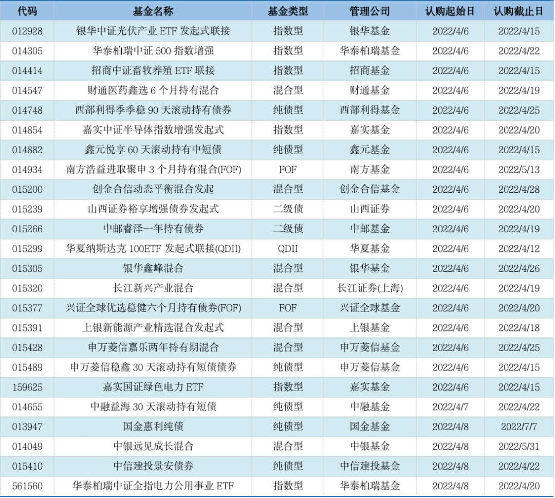 上周共有20只新发基金开始认购,其中混合型基金4只,指数型基金7只,纯债型基金6只,FOF产品3只。