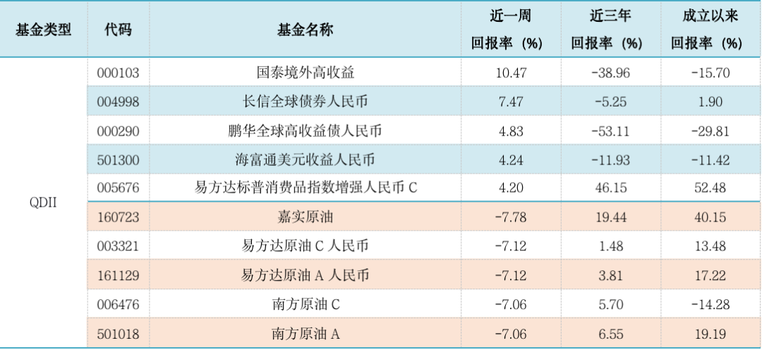 表4:上周各海外基金收益表现(涨幅前5位及跌幅前5位)
