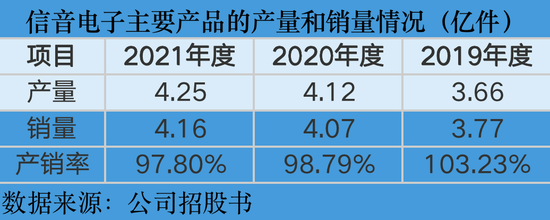 据招股书披露,2019年-2021年,信音电子主要产品产销率分别为103.23%、98.79%、97.8%,出现些许下滑。