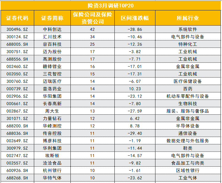 一季度险资调研行业方面,涉及电气部件与设备、系统软件、特种化工、医疗保健设备等“硬科技”与服装、旅游度假、家庭娱乐等大消费板块的龙头股。但进入到3月以来,保险公司关注度高的个股逐渐转向“硬科技”。