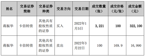卡倍亿2022年3月23日公告称,公司董事蒋振华于2022年3月22日卖出持有的公司可转换公司债券“卡倍转债”,该交易构成短线交易行为。蒋振华先生本次短线交易行为产生的收益为6987.45元,已将获利金额全数上交公司。