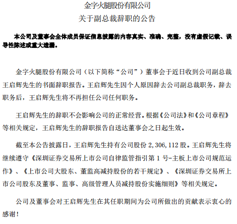 值得一提的是,上述涉事高管王启辉最近刚刚离职。就在4月9日,金字火腿公告称,公司董事会于近日收到公司副总裁王启辉先生的书面辞职报告。王启辉先生因个人原因辞去公司副总裁职务,辞去职务后,王启辉先生将不再担任公司任何职务。