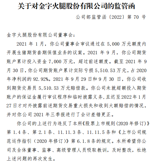 3月30日,深交所向金字火腿股份有限公司(金字火腿,002515.SZ)发出监管函。监管函指出,2021年1月,金字火腿董事会审议通过在5,000万元额度内开展生猪期货套期保值业务的议案。2021年9月,公司期货账户累计投入资金7,000万元,超过前述额度。截至2021年9月30日,公司期货账户累计实际亏损5510.53万元,占2020年净利润的92.92%。2021年9月29日和9月30日,公司收到期货交易员5510.53万元赔偿款。公司未就超额投入期货账户的保证金履行审议程序和临时披露义务,且迟至2022年1月27日才对外披露前述期货交易重大损失和收到大额赔偿的情况,并对公司2021年三季报进行了会计差错更正。上述行为违反了深交所相关规定。