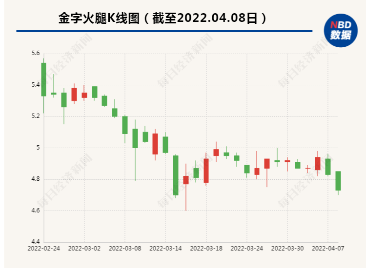 从股价表现来看,金字火腿自今年1月14日出现阶段高点6.46元/股以来,出现一路下跌,一度跌至阶段低点4.79元/股,跌幅达到25.85%;截至周五收盘,该股报4.73元/股,最新总市值仅为46.27亿元。