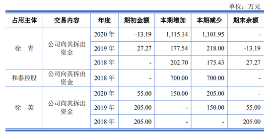 据披露,公司于2020年向实际控制人徐青拆出资金1115.14万元,其中徐青从公司拆借的 821.04万元借予朋友公司经营、69.1万元用于其子女生活学习消费、75万元用于发放员工年终奖等;控股股东和泰控股曾在2018年向公司拆入资金700万元;报告期初,实控人一致行动人徐英个人原因累计占用公司资金205万元,上述款项本金及利息已于2020年10月收回。