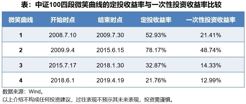 基金定投由于是分批在市场不同点位进行买入,可以有效替代主观择时的策略,通过拉长时间平滑成本,降低高点买入后被套牢的风险。所以市场波动恰恰最能充分发挥基金定投的优势,有效地降低基金的平均申购成本,在熊市或者下跌状态时恰恰最能积攒便宜的筹码,等到市场开始回升就能吃到定投的红利。那么这样一种先下跌后上涨的定投过程就能形成定投的微笑曲线,下图展示了2003年以来中证100指数历史上的五次微笑曲线,可以直观的看出收益是颇丰的。