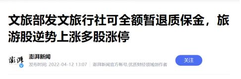 消息面上,4月11日,文化和旅游部办公厅再次印发《关于进一步调整暂退旅游服务质量保证金相关政策的通知》指出,为进一步用好旅游服务质量保证金政策,支持旅行社行业纾困发展,文化和旅游部决定,旅行社可全额暂退保证金或暂缓交纳,补足保证金期限延至2023年3月31日。