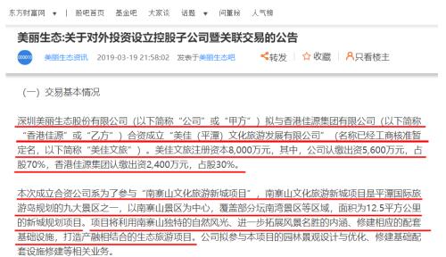 早在2019年公告内容中,美丽 生态(000010)拟与大股东佳源创盛集团旗下的香港佳源集团有限公司合资成立“美佳(平潭)文化旅游发展有限公司”。美佳(平潭)文化旅游发展有限公司注册资本 8000 万元,其中,公司认缴出资 5600 万元,占股 70%,香港佳源集团认缴出资2400 万元,占股 30%。