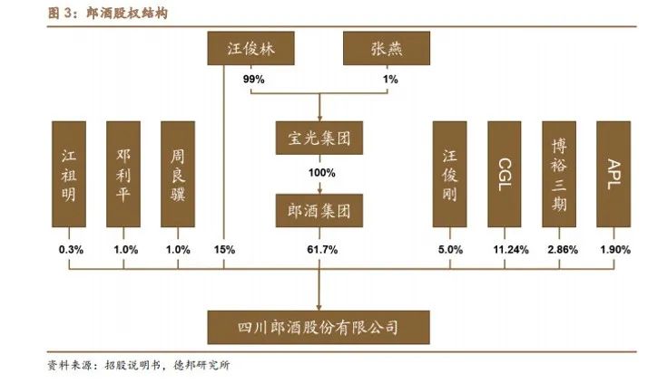其实,此前郎酒上市失败,首先就跟当年的改制以及此后的股权脱不开关系。目前汪俊林家族握有郎酒76%的股权,而其他三家主要的机构股东CGL(Crystal Glitter Limited)、博裕三期、APL(Apsif Pte Ltd)持股16%。