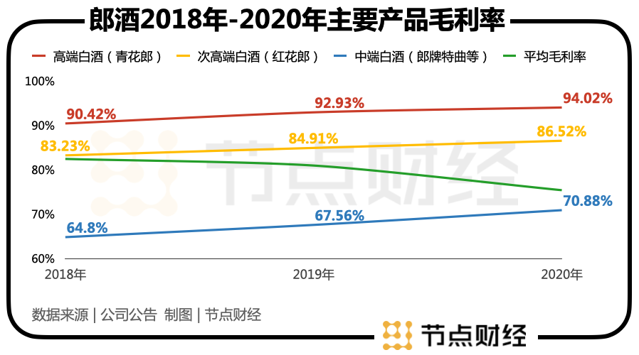 郎酒的产品收入也体现了这种结构。从2017年至2020年,其高端和次高端的收入占比从40%增长到了65%,其产品主要就是青、红花郎酱香酒。而从毛利率来看,据招股书显示,2020年郎酒的高端毛利率达94.02%,甚至压了茅台一头,而所有产品的平均毛利率也达到82.43%。