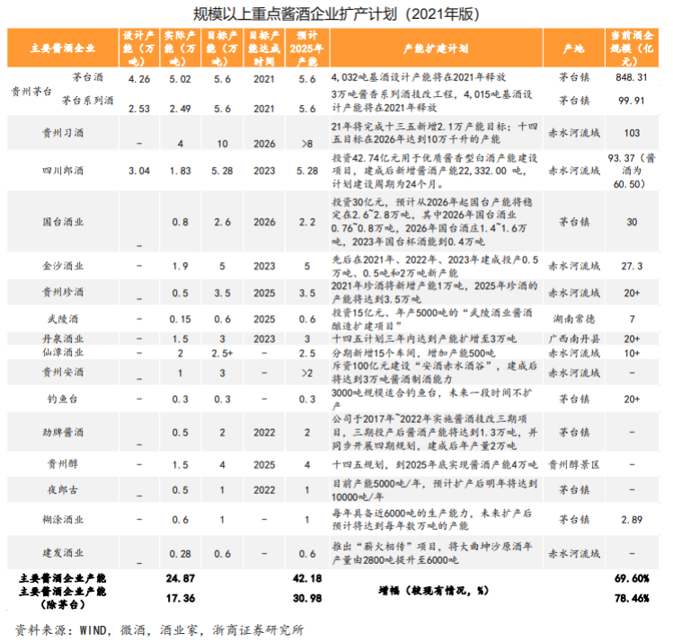 其实,酱酒之所以乱象丛生,很大程度上是由于酱酒产能有限,供不应求。2020年酱酒总产能仅约60万千升,占白酒总产能约8%,而由于工艺周期长,产地土地资源紧缺,提升产能并不容易,这对茅台、郎酒等产能利用率较高的品牌尤其如此。