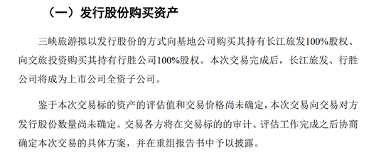 公告显示,经交易各方协商,公司确定本次发行股份购买资产的发行价格为5.46元/股,鉴于交易标的资产的评估值和交易价格尚未确定,故本次交易发行股份数量尚未确定。同时,公司拟向不超过35名特定投资者以非公开发行股票的方式募集配套资金,募资总额不超过本次重组交易价格的100%,且募集配套资金发行的股份数量不超过本次发行前三峡旅游总股本的30%。