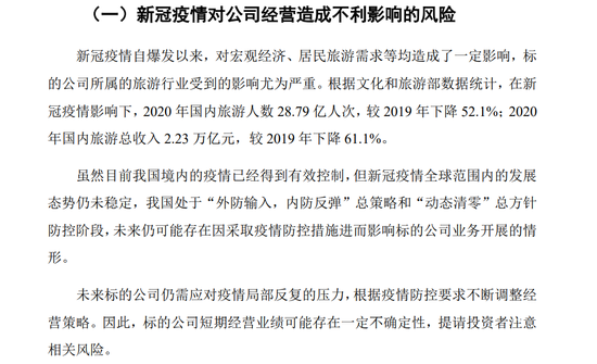 此外,三峡旅游也提到新冠疫情对公司经营造成不利影响的风险。公司表示,新冠疫情自爆发以来,对宏观经济、居民旅游需求等均造成了一定影响,标的公司所属的旅游行业受到的影响尤为严重。